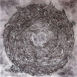 Estos dibujos los rompo y los reconstruyo para regenerar la imagen que finalmente se plasmo en hierro y se oxida. No paro el proceso de deterioro para que se siga desapareciendo la imagen con el tiempo.