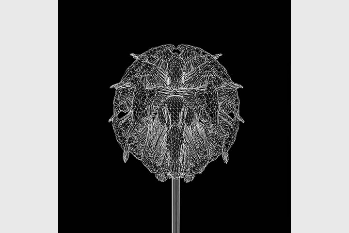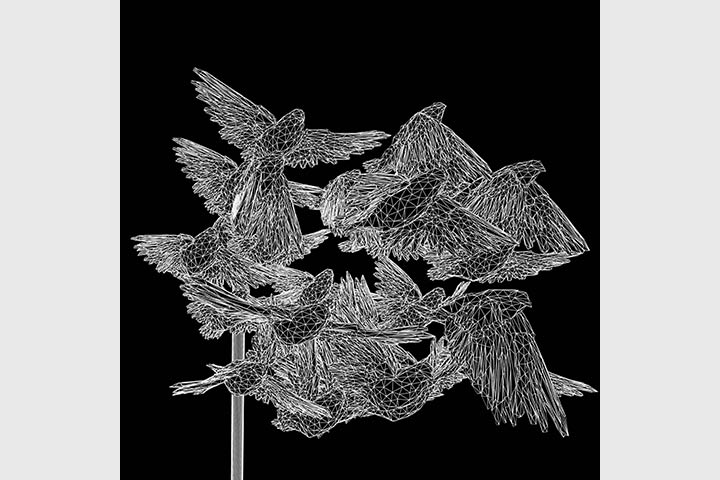 Al frente de este, está construida otra cerca de pájaros, con las mismas 132 piezas, pero esta vez hechas en acero y dispuestas con un patrón más orgánico que cuelga del techo.
