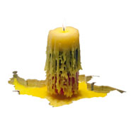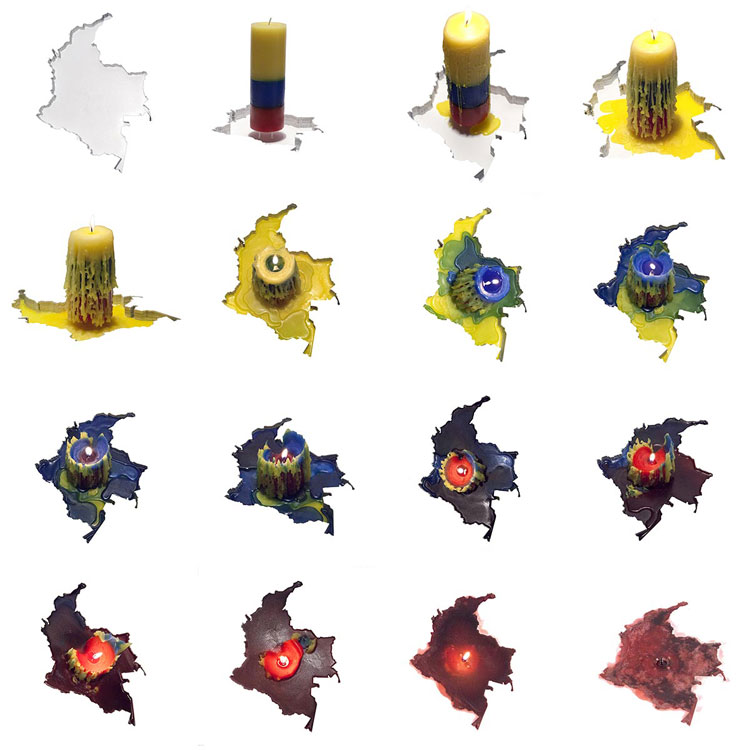 El cirio se derritió esparciendo en la forma de mapa de Colombia, la riqueza (amarillo) mezclándose con los mares (Azul) generando la naturaleza (Verde) para terminar con sangre (Rojo).