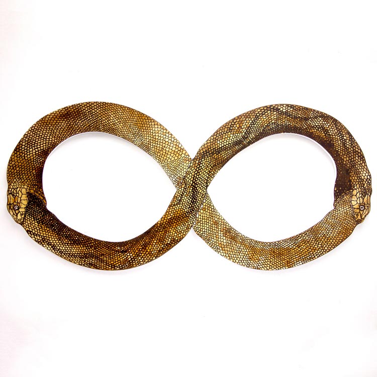 Un signo de infinito con un Ouroboro o mito de la serpiente doble, donde el que come está siendo comido por la propia presa. La existencia de cada uno peligra y al mismo tiempo se alimenta del otro. Y sólo en un equilibrio perfecto puede hacer que los dos existan.
